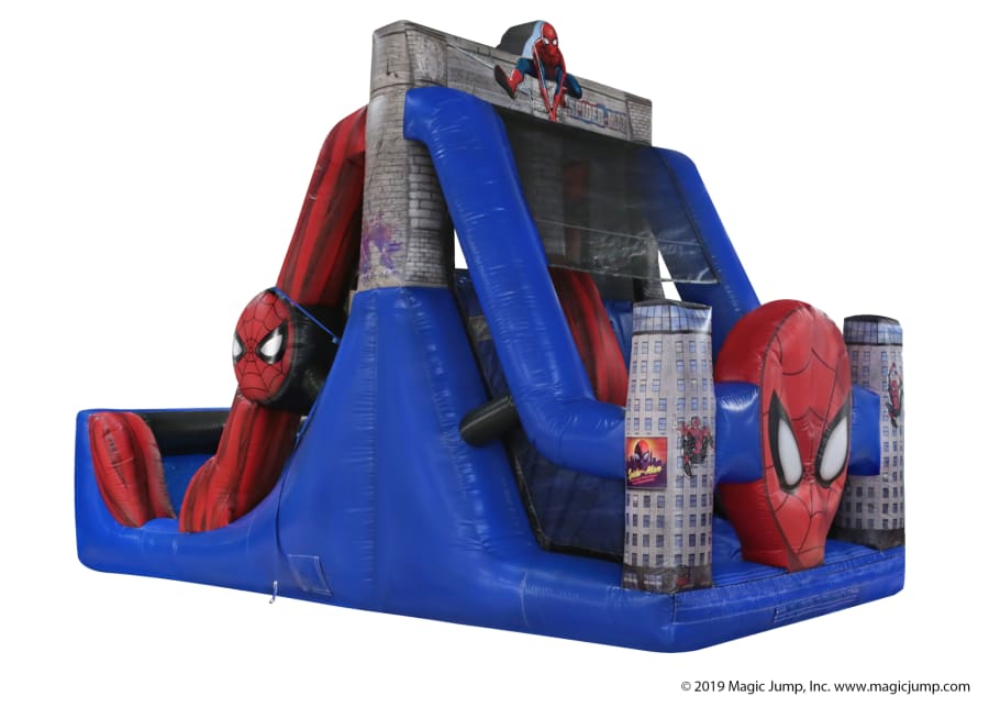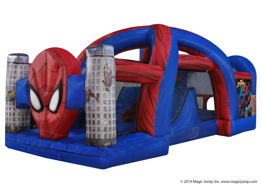 This50-Foot-Long Spider-Man-themed Obstacle Course is two (2) pieces and it features a special non-slip material that is for safe use with water. Piece #1 with entrance features a bounce & obstacle area reminiscent of the New York City skyline, with small climber/slide and Black Costume Spider-Man and Carnage character obstacle pop-ups. Piece #2 features tall climber/slide skyscraper unit with a web-slinging Spidey on top and a water misting system that sprays patrons as they slide down into the fun U- shaped splash zone. Exterior includes printable areas with character graphics.