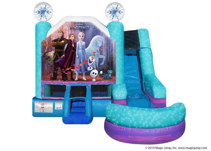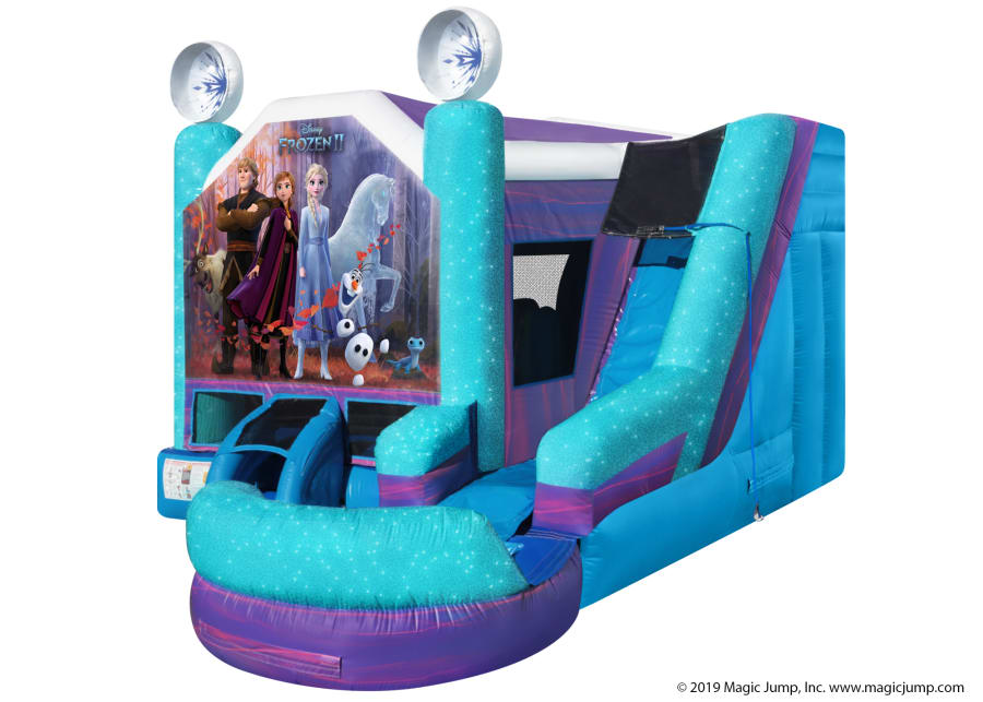 BIGGER THAN IT LOOKS!!!...Embark on a mythic journey with Elsa, Anna, Olaf, Kristoff and Sven with Magic Jump's Official DISNEY FROZEN 2 6-in-1 Combo unit. This Wet or Dry combo ride features six different inflatable activities: (1) a bigger bouncing area; (2) a basketball hoop; (3) inflated push-through, obstacle pop-ups; (4) a wall climber; (5) a "high platform" wet or dry slide; and (6) a removable pool/landing for wet use. It also features a special non-slip material that Magic Jump uses for safe use with water.