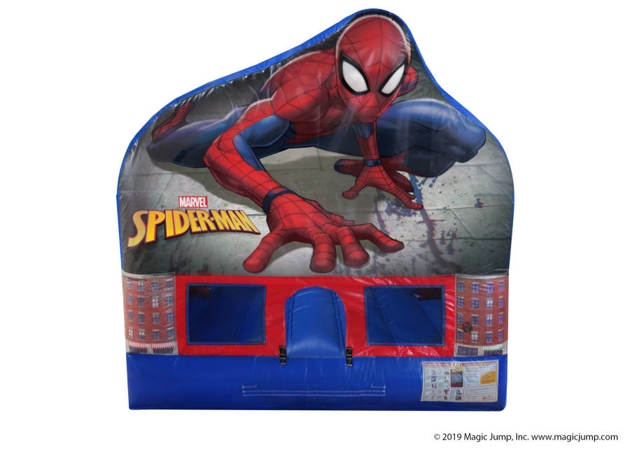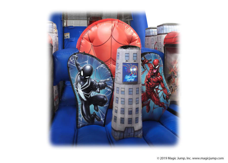 This50-Foot-Long Spider-Man-themed Obstacle Course is two (2) pieces and it features a special non-slip material that is for safe use with water. Piece #1 with entrance features a bounce & obstacle area reminiscent of the New York City skyline, with small climber/slide and Black Costume Spider-Man and Carnage character obstacle pop-ups. Piece #2 features tall climber/slide skyscraper unit with a web-slinging Spidey on top and a water misting system that sprays patrons as they slide down into the fun U- shaped splash zone. Exterior includes printable areas with character graphics.