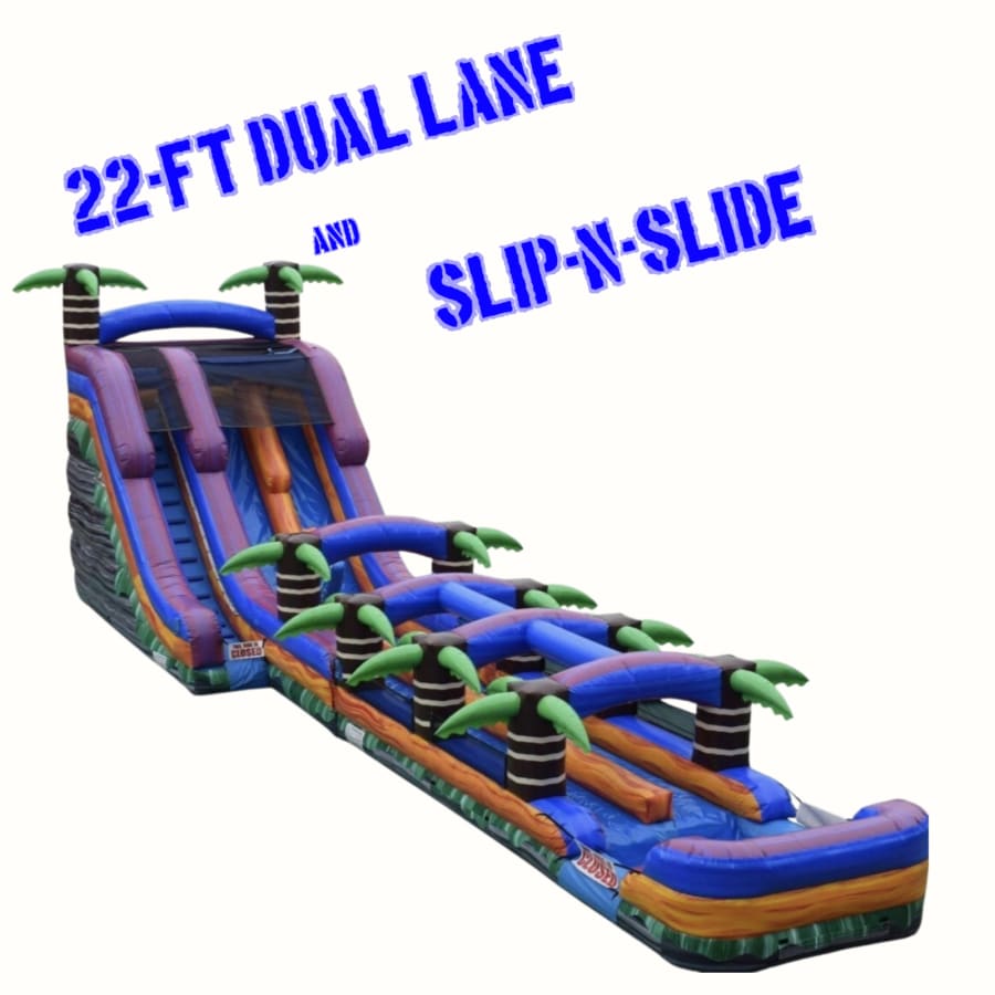 Looking for some fun and excitement at your next party or event? Look no further than the 22ft tropical slide with slip and slide! This impressive attraction is great for large parties and adults, adding the perfect touch of adventure to any gathering. With its vibrant tropical theme, everyone will feel like they're on a beach vacation as they slide down this exhilarating ride. And with included slip and slide features, riders can glide along even faster for an added thrill! Whether you're planning a summer get-together, corporate event, or birthday celebration, this inflatable water slide is sure to be a crowd-pleaser that creates lasting memories for all who experience it. So why wait? Book your rental today and let the good times roll!