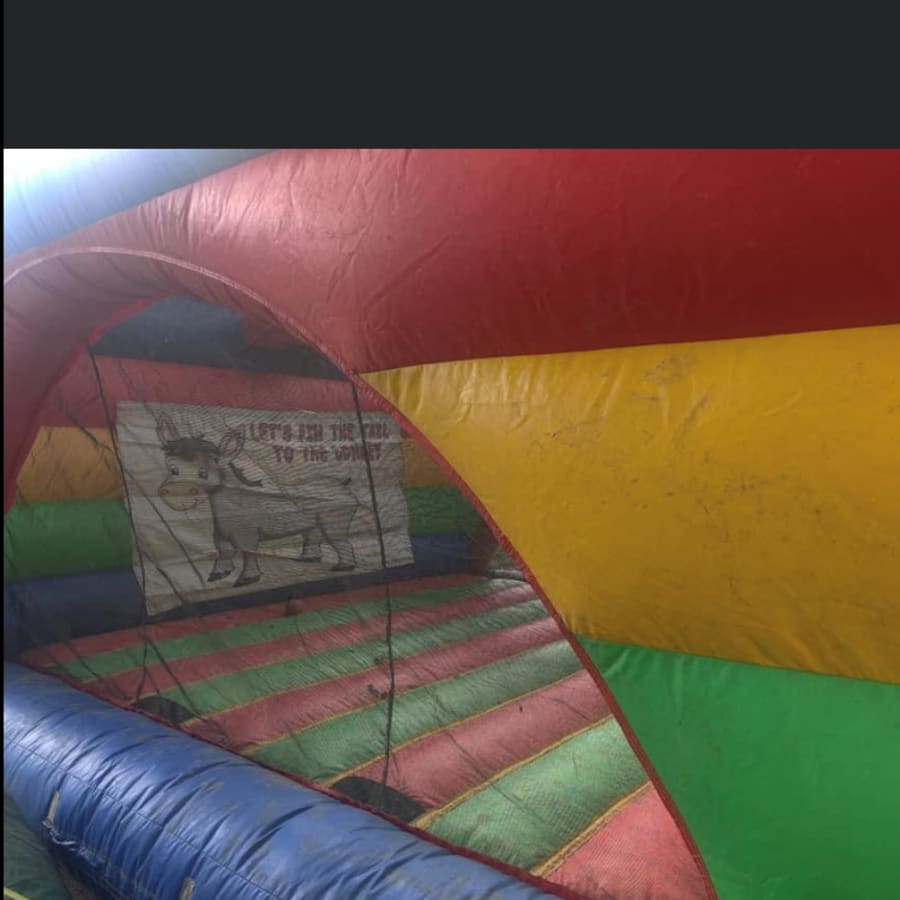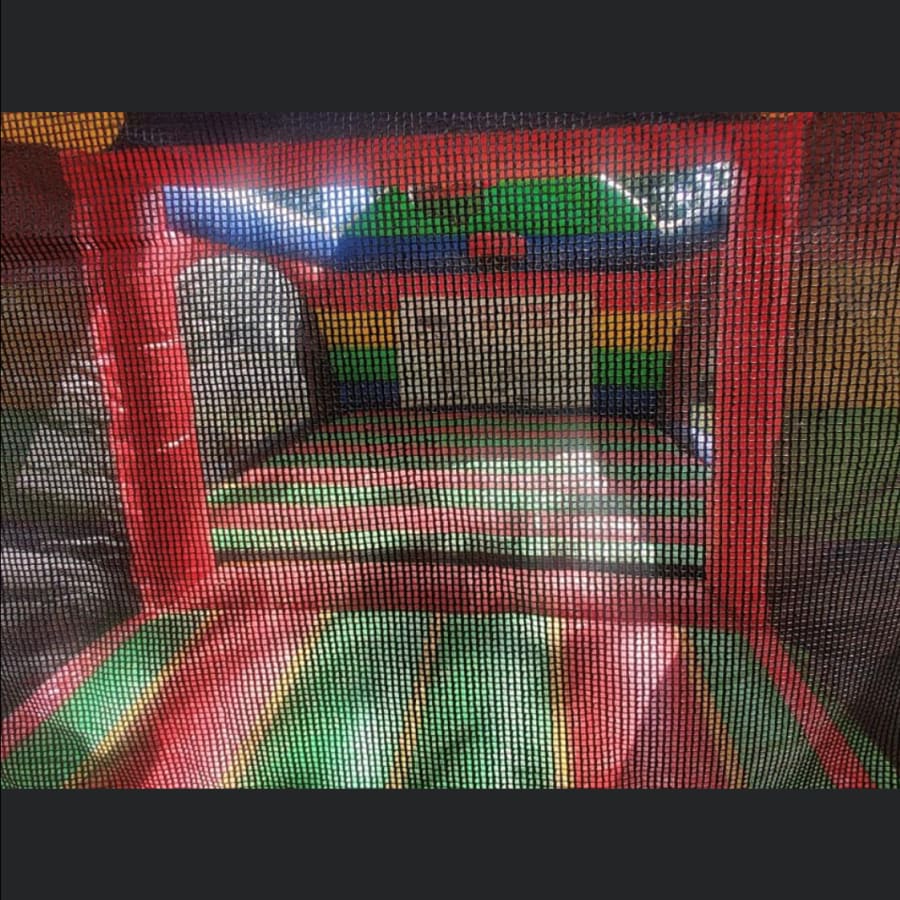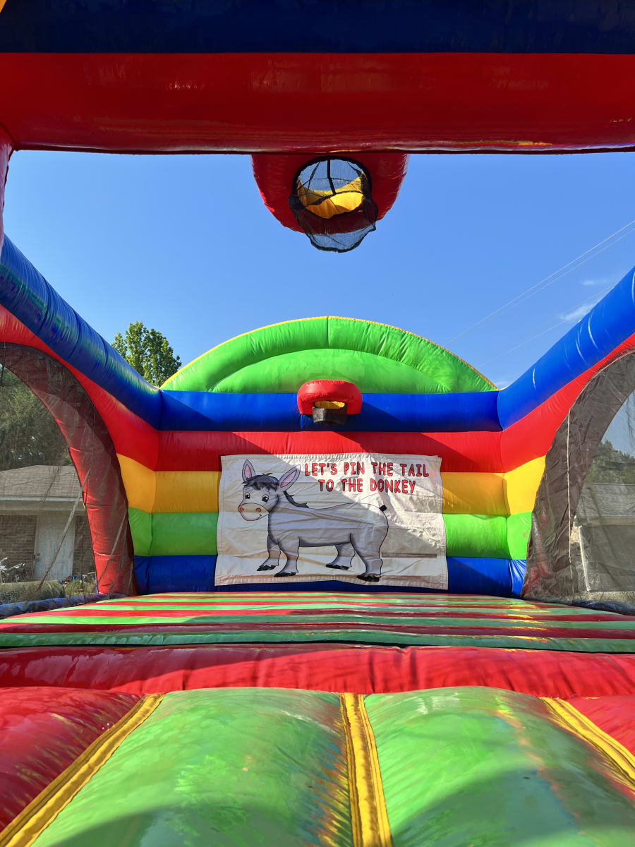 24 x 24 Large Basketball Court Bounce House Inflatable is full of activities. It has two attached basketball goals inside two of the corners. Makes for a great time for kids and adults. It also has a pin the tail on the donkey on the back wall for even more possibilities and fun!